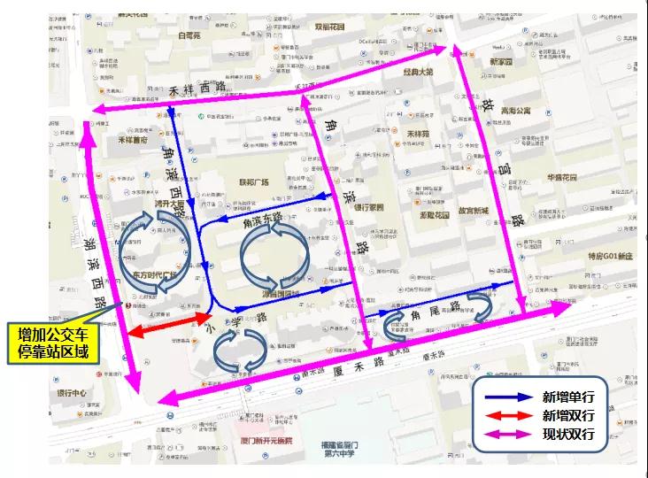 角濱東路(角濱路口至角濱西路口段)實(shí)行機(jī)動車由東往西方向單向通行,禁止機(jī)動車由西往東方向行駛,與角濱西路、小學(xué)路東段形成微循環(huán)。