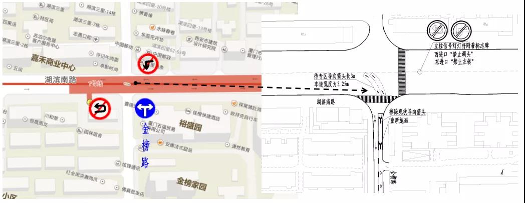 金榜路(廈禾路口至禾祥東路口段)從由南往北單向通行改為雙向通行;金榜路與匯文路交叉路口東、南、北三個方向進(jìn)口道禁止車輛左轉(zhuǎn);金榜路與禾祥東路交叉路口東、西、南、北四個方向進(jìn)口道禁止車輛左轉(zhuǎn)。
