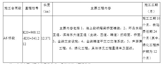 項目建設地點位于福建省廈門市,主要內(nèi)容包括1、海上段鋼箱梁橋面鋪裝;2、環(huán)島東路互通、濱海東大道互通(主線、匝道、輔道)的路面、橋面;3、全線交安設施;4、全線輔道平交口交信系統(tǒng);5、聲屏障工程;6、綠化工程。建安造價約4.6416億元。施工工期10個月,缺陷責任期24個月。