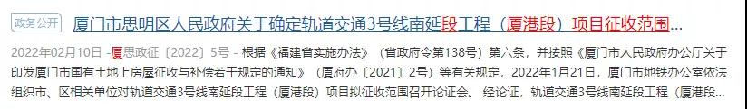 經(jīng)論證,軌道交通3號線南延段工程(廈港段)項目符合國民經(jīng)濟和社會發(fā)展規(guī)劃、土地利用總體規(guī)劃、城鄉(xiāng)規(guī)劃和專項規(guī)劃,確定以廈門市自然資源和規(guī)劃局《建設(shè)項目用地預(yù)審與選址意見書(用字第350200202100359號)附圖載明的建設(shè)用地范圍作為軌道交通3號線南延段工程(廈港段)項目的征收范圍,現(xiàn)予以通告。