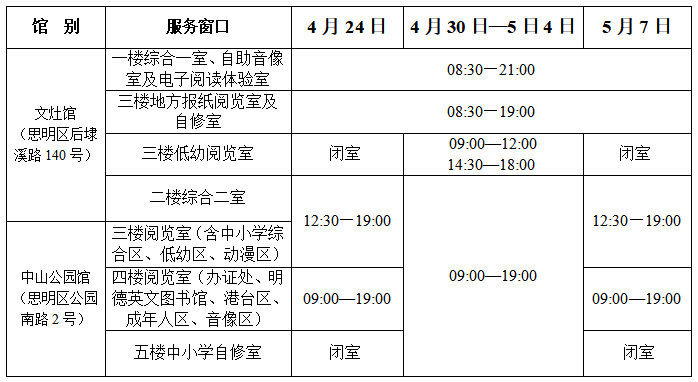 根據(jù)上級通知精神,為做好疫情防控工作,讀者須預(yù)約入館。2022年五一假期(2021年4月30日至5月4日)廈門市圖書館各館區(qū)、分館和汽車圖書館等具體開放時間如下: