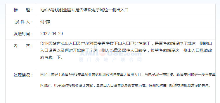 對(duì)此,廈門(mén)市發(fā)改委回復(fù):您好!軌道6號(hào)線集美創(chuàng)業(yè)園站規(guī)劃預(yù)留跨集美大道出入口,與電子城一帶對(duì)接。軌道集團(tuán)將進(jìn)一步與集美區(qū)政府、電子城對(duì)接接駁設(shè)計(jì)方案,具體出入口設(shè)置以最終實(shí)施為準(zhǔn)。感謝您對(duì)廈門(mén)軌道交通規(guī)劃建設(shè)的關(guān)注。