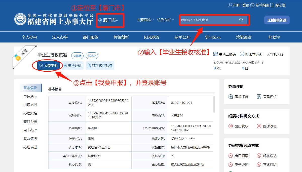 方式一:登錄“福建省網(wǎng)上辦事大廳廈門分廳” (http://xm.zwfw.fujian.gov.cn),將地址定位至【廈門市】,在搜索框內(nèi)輸入【畢業(yè)生接收核準】,點擊【我要申報】并登錄即可在線辦理。