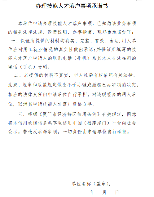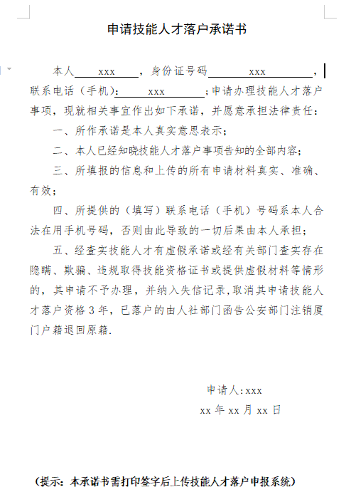 個(gè)人申請(qǐng)技能人才落戶承諾書