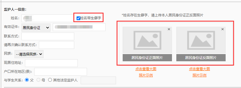 ②如果監(jiān)護(hù)人姓名帶生僻字,請(qǐng)勾選“姓名帶生僻字”,并上傳身份證照片。