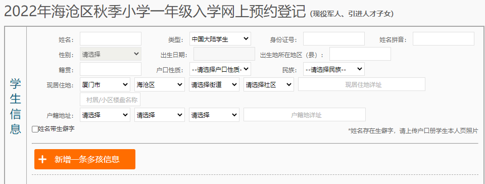 ?、谌绻暮⒆邮嵌喟?,點(diǎn)擊“新增一條多孩信息”,根據(jù)系統(tǒng)提示填寫登記信息。