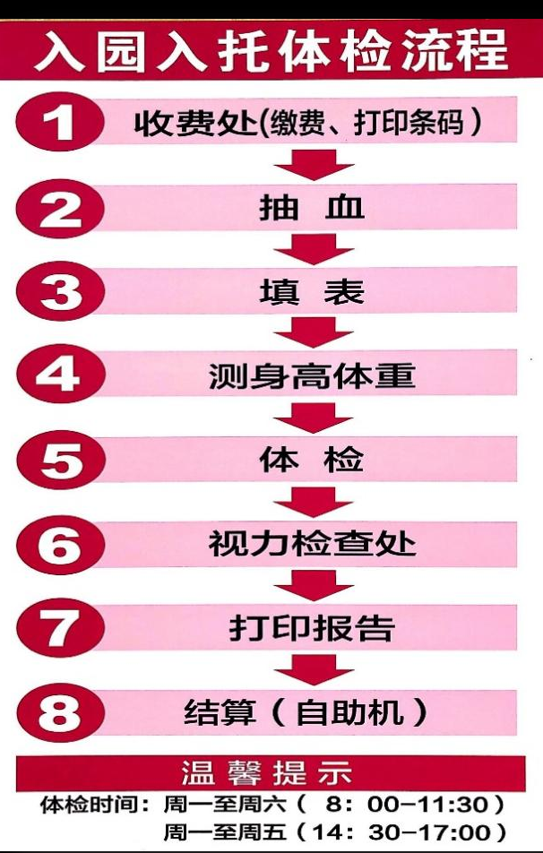 3、 寶寶入園入托體檢當(dāng)日無需空腹。保證寶寶在體檢前一天休息好,以免影響結(jié)果的準(zhǔn)確性。
