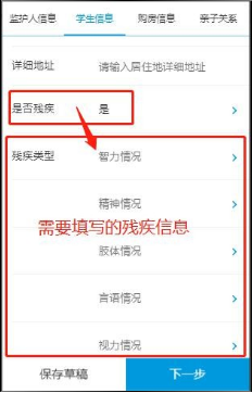 是否殘疾:系統(tǒng)默認(rèn)選擇“否”,如果該學(xué)生殘疾請(qǐng)選擇“是”,并選擇殘疾類型、填寫殘疾證號(hào)和上傳證明材料,如果是多重殘疾請(qǐng)選擇多個(gè)殘疾類型。
