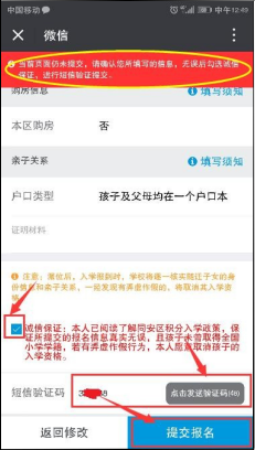 頁面拉到底端,勾選下方紅色字體部分的保證信息。點(diǎn)擊“發(fā)送驗(yàn)證碼”,將收到的短信驗(yàn)證碼輸入方框內(nèi),然后點(diǎn)擊“提交報(bào)名”,進(jìn)入審核情況界面,即本次報(bào)名成功。