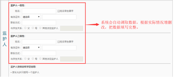 2.如果系統(tǒng)自動填寫的監(jiān)護人信息有誤,家長也可以根據(jù)實際情況修改或者刪除由系統(tǒng)自動填寫的監(jiān)護人信息,系統(tǒng)允許只填寫一位監(jiān)護人,但“監(jiān)護人一”必須填寫,不能放空。