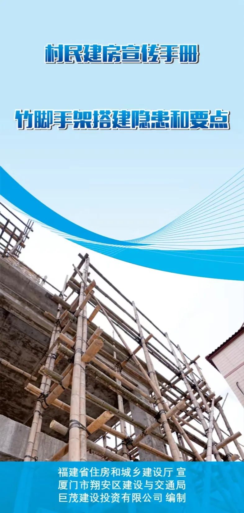 日前,福建省住建廳組織廈門市翔安區(qū)建設與交通局、巨茂建設投資有限公司編制了《農村竹腳手架搭建常見隱患和要點一張圖》(以下簡稱一張圖),現(xiàn)予印發(fā)。請相關單位抓好宣貫工作,迅速印發(fā)縣(鎮(zhèn)、村),督促縣鄉(xiāng)將一張圖納入工匠、鎮(zhèn)(村)干部輪訓課程和農房建設審批前的安全宣講內容,并在施工現(xiàn)場進行張貼,逐步提升基層干部群眾質量安全常識和工匠操作水平。